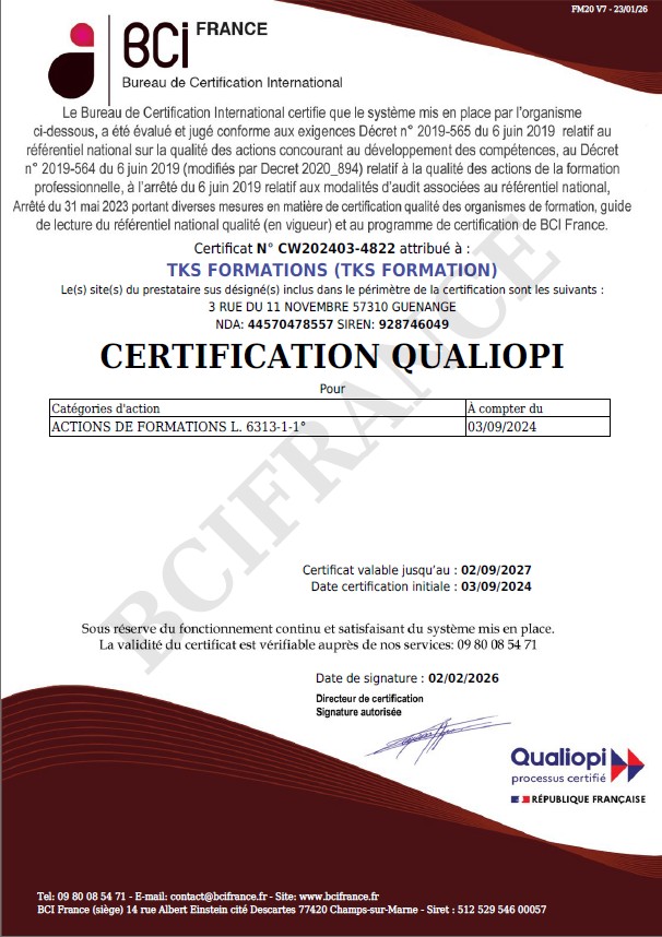 Je venais d’un tout autre domaine et j’avais beaucoup d’appréhension. Chez TKS Formations, je me suis sentie accompagnée du début à la fin. Le cadre est rassurant, les formations sont structurées et on repart avec de vraies compétences professionnelles.